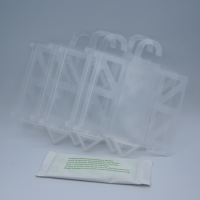 - Piège rectangulaire en plastique qui peut être suspendu.